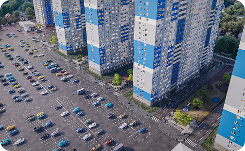 Открытая парковка во дворе комплекса. Предусмотрены отдельные заезды и выезды для каждого литера. Асфальтированное покрытие в паркинге обеспечивает удобство проезда и парковки, а также защищает от повреждений.